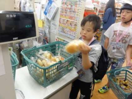 明日の朝食の買い物です。上手に選び,買い物かごに入れ,レジまで持っていくことができました。