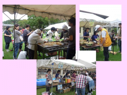 グランドにステージコーナー,プレイコーナー,そして,焼きそば・フランクフルトコーナー,飲み物コーナー,プラ板づくり,うちわ作りコーナー等が設置されています。それぞれのコーナーでのようすです。大きな鉄板で目の前で焼く,焼きそばコーナーは,常に列ができていました。