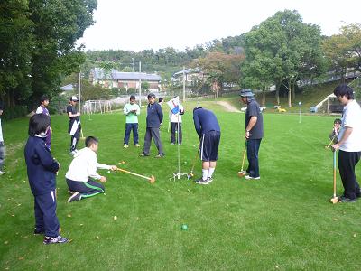 本日,高等部東タイムで冬芝生が茂ったばかりのグランドでグランドゴルフを行いました。形や距離,広さの違う6つのコースを巡り,ゴルフのようにボールをホールに入れるまでの打つ回数の少なさを競います。ボールを豪快に打つ生徒もいればホールを狙う正確さを求めて打つ生徒とそれぞれの打ち方に個性が出ていて皆がとても楽しそうでした。