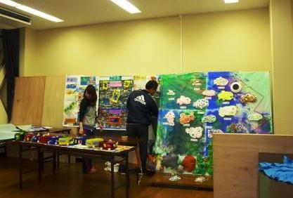文化祭を明後日に控え,中校舎1階会議室が展示会場へと変身します。先週金曜日放課後より,会場の準備が進められています。作品から出てくる児童生徒のエネルギーが会場に満ちてきました。