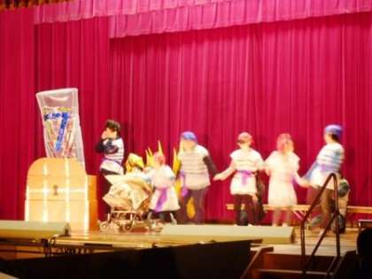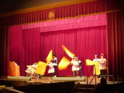 午前の後半は,中学部1年生による『宝を手に入れろ イースト海の海賊たち』です。中学部1年生7人が,海賊に扮しました。宝箱を見つけた海賊たちですが,一人の力では,宝箱をあけることができません。そこで,みんなで力を合わせることで,ようやく宝箱をあけることができました。
