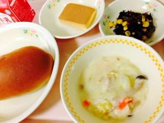 今日の献立は,黒糖コッペパン・牛乳・さつまいものクリームシチュー・ひじきのソテー・カラメルプリンでした。