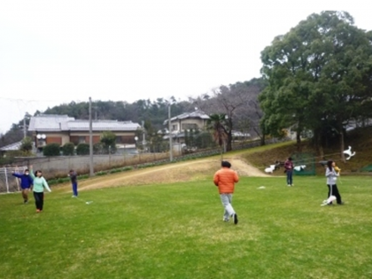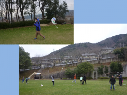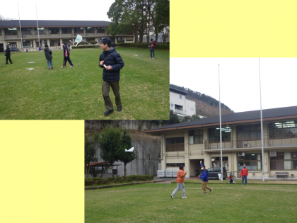 中学部3年生は,学年での学習で,ビニール袋と竹ひごを使って凧を作りました。ビニール袋には,それぞれが好きな絵をマジックで書きました。出来上がった凧をもってグランドに集合し,みんなで楽しく凧あげをしました。曇り空の寒い日でしたが,芝生のグランドを駆け回る子ども達の心身は,ぽかぽかでした。