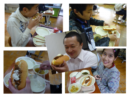 給食のカレンダーでは,自分たちでパンに切りこみを入れ,フライやソテーをはさんで作る「フィッシュサンド」を紹介しました。教室では,スプーンやフォークを使って上手に「フィッシュサンド」を作っていました。生徒達は,「少し魚が大きいけれど,楽しいです」と話してくれていました。