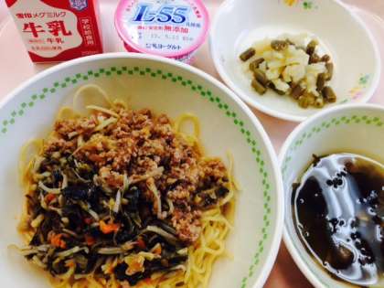 今日の献立は,ジャージャー麺・牛乳・じゃがいもと三度豆の炒め物・わかめスープ・ヨーグルト(中学・高等部のみ)でした。