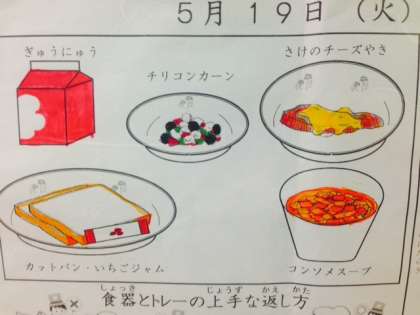 今日の献立は,カットパン・いちごジャム・牛乳・さけのチーズ焼き・チリコンカーン・コンソメスープでした。