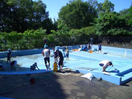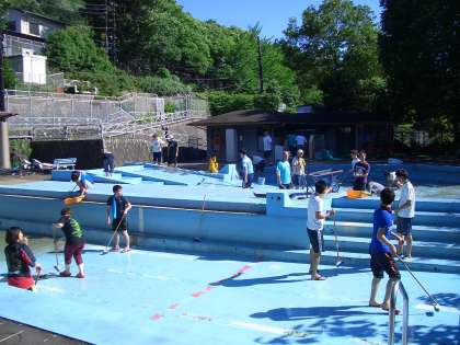 本日放課後,15日(月)から始まる水泳学習に向けて,教職員でプールの清掃を行いました。プールの水を抜き,たくさんの落ち葉や木の枝等を取り除き,ブラシでプールの汚れを落としたり,プール周りの雑草を鎌などを使い刈りました。また,プールへと続く階段やスロープに蓄積されていた腐葉土等もきれいに取り除きました。ピカピカになったプールで子どもたちの歓声が聞こえる日が待ち遠しいです。