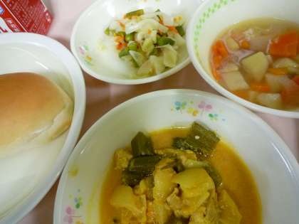 今日の献立は,ミルクコッペパン・牛乳・鶏肉のカレーヨーグルト煮・野菜のドレッシング和え・じゃがいものベーコン煮でした。
