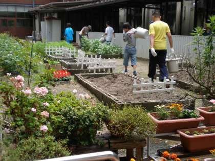 中学部では,紙を作る班,ビーズを紐に通したりする班,農園芸をする班に分かれて活動をしました。