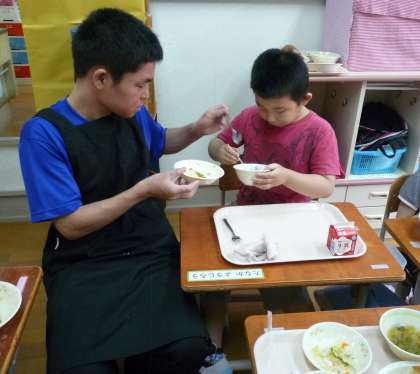 いつものビーンズオムレツは,ケチャップやウスターソースから作るミックスソースですが,今日はバターと小麦粉から作るホワイトソースをかけて食べました。パセリの緑色が彩りのアクセントになり,はじめてのソースに驚いている子や,気に入ってパンにぬる子もいました。