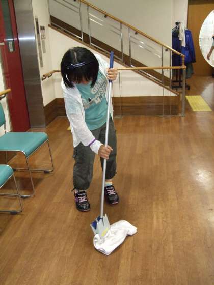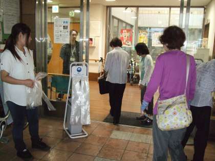 健康体操参加者に傘袋を手渡しました。挨拶担当,手渡し担当,案内担当と,各自が立ち位置も考えて,おもてなしを分担していました。廊下が雨水で濡れているのを見ると,自分からモップを取りにいき,床を拭いていました。先生の指示がなくとも,自分で考え自分で行動する力が,このおもてなし活動で育まれています。