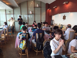 まずは昼食場所のガーデン・レストランで食事です。今日は鶏の照り焼きがメインのお弁当です。みんな元気で食欲が進みます。