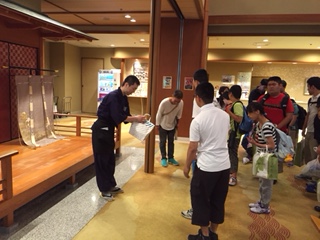 宿の人に二日間お世話になったお礼を言って,みんなで手作りしたプレゼントをわたしまた。