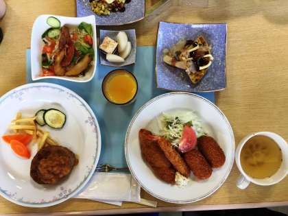 夕食のようすです。メニューは、ハンバーグ,エビフライ,魚のフライ,クリームコロッケ,スープ,サラダ,ご飯,デザート等たっぷりメニューです。