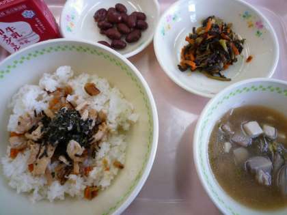 今日の献立は,麦ごはん・牛乳・きつねちらしの具・小松菜のおかか煮・金時豆の甘煮・のっぺい汁でした。