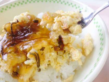 天津飯は,久しぶりの献立です。かには,紅ズワイガニを使い,たまねぎやたけのこ,しいたけと一緒に卵でとじています。甘めに仕上げたあんをかけ,丼にして食べます。「かにの味がします!」「とろっとしたあんが食べやすいです」と好評でした。