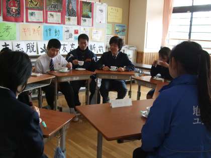 活動の最後は全員でティータイムです。温かい紅茶を飲みながら「○○先輩は元気にしていますか」「部活動ではどんなことをしているのですか」等々,生徒達の会話は絶えることがありませんでした。
