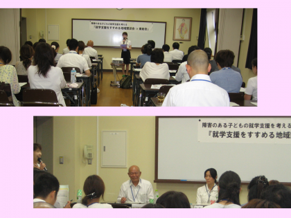 最初に教育委員会より京都市の「就学相談のシステム」について説明がありました。次に、地域生活支援センター・小学校・保護者・支援学校の立場の皆さんから話題提供をいただき,就学相談,支援のあり方について意見交換をしました。パネリストの方々から,子どもたちの状況からどのような教育・支援をしていくか,子どもたちに合った“学びの場”について,「一人で悩まず,いろいろなつながりをもっていっしょに考えていきましょう。」とお言葉がありました。その後,ご希望の方には学校見学,個別の相談をして終わりました。参加された方々からは「まずは小学校に相談に行くこと,そして何度でも相談してもよいことがわかり,ほっとした。」「具体的な説明や実際の体験が聞けてよかった。」等の感想をいただきました。多数ご参加いただきありがとうございました。