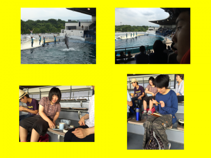 お昼御飯はイルカショーを観ながらお弁当です。イルカの大ジャンプに生徒達は大興奮の拍手喝采!大喜びのランチタイムとなりました。