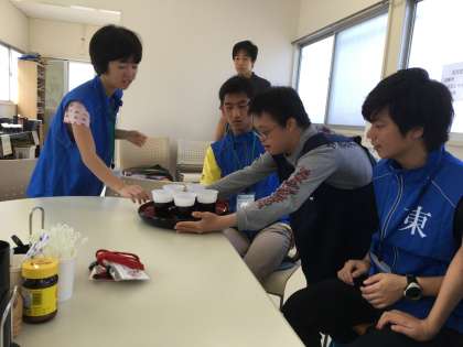 役割活動ユニットメンバーは,来校者へのコーヒーサービスはすでに経験済ですが,学校から出向いてのおもてなし活動は初体験です。地域実践ユニットメンバーが見守る中,丁寧なコーヒーサービスの練習ができました。