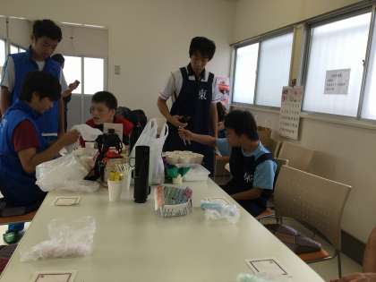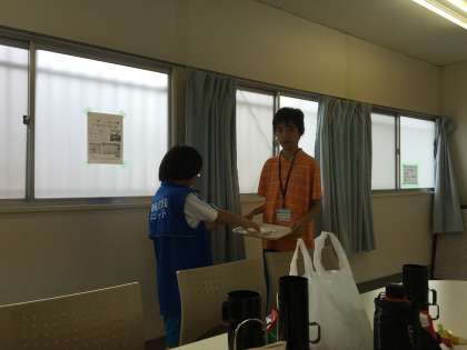 高等部地域実践ユニットの先輩と中学部地域メンテナンス班の後輩がペアになり,ドリンクサービスの準備をします。