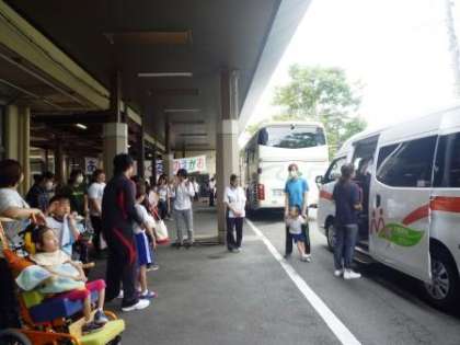 『行ってきます会』の後,大型バスと福祉タクシーにそれぞれ分かれて乗り,小学部の児童やランニング中の中学部生徒,教職員が見送る中,大型バスと福祉タクシーは,学校を出発しました。総合育成支援課から森田指導主事もお見送りいただきました。