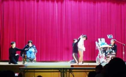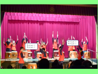 オープニングは,高等部和太鼓グループの和太鼓演奏です。演目は『お祭り太鼓』です。生徒たちは,少し緊張しながらも「わっしょい!わっしょい!」のかけ声とともに元気に力強く演奏しました。