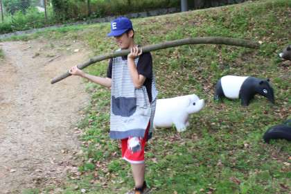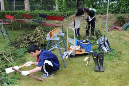 集めた木はノコギリで切り,花壇を作るときに活用します。伐採した木を捨てるのではなく手を加えることで利用していきます。資源を有効利用しながら環境整備をすることができました。