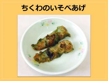 「ちくわのいそべあげ」は新献立でした。青のり・米粉・片くり粉・水を混ぜてつくった衣を,ちくわにつけて揚げています。小学部は1個,中学・高等部は2個を食器に盛りつけ,おいしそうに食べていました。