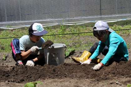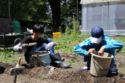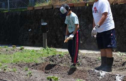 晴れわたる空のもと,中学部ワークスタディ農園芸班は夏野菜を育てるための『土づくり』をしました。畑を耕し,石灰をまき,土を混ぜました。おいしいトマトやキュウリが実る日が楽しみです。