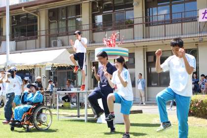 準備運動は「めしあがれ」という曲に合わせてみんなで体を動かしました。子どもたちも指導者も力いっぱい準備運動ができました。