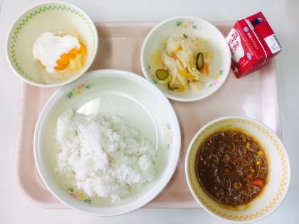 体育祭の日の給食は,みんなが大好きなキーマカレーでした。ルーから手作りのキーマカレーは,優しい味のカレーです。フルーツのヨーグルトかけをデザートに食べて,午後からの競技もがんばりました。