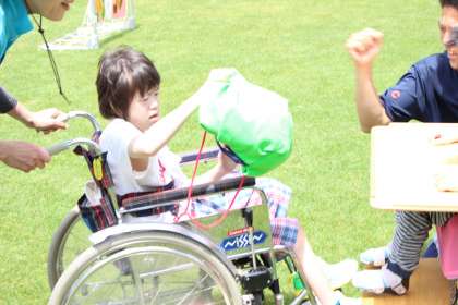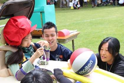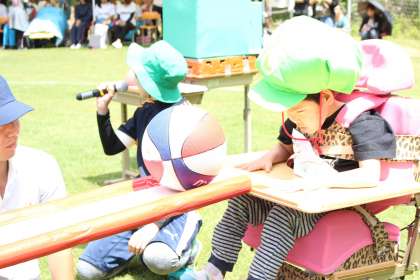 学部の枠を越えた縦割り団体種目です。マリオの帽子をかぶった選手はそれぞれの課題にチャレンジし,ゲームをクリアして帽子を次の選手につなぎます。最後はくるくる動くバルーンを見上げみんな大喜びでした。