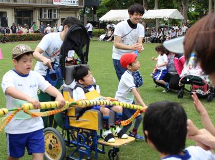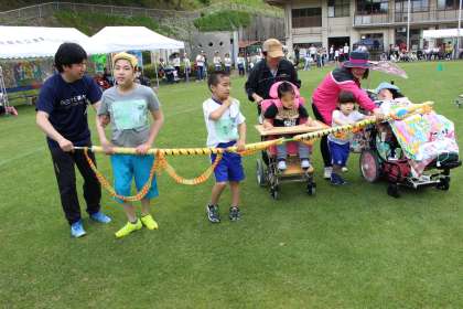 「友だちと協力して,次の友だちのところまで進む」をテーマに,友だちと「いちにー,いちにー」のかけ声でペースを合わせながら,一つにつながった長いバトンをリレーしてゴールしました。