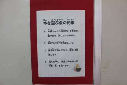 本日,午後からランチルームで『選書会』が行われました。最初に,担当の松井先生から,「本を曲げたり,汚したりしないようにしましょう」「友達と交代に見るようにしましょう」「一人2冊まで選べます」などの注意事項の説明がありました。