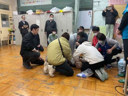 洛和会音羽病院の救命救急室より救急救命士の方をお迎えして、高等部の生徒を想定した救急シミュレーションを行いました。今年度は、学習中に脚立から落下し頭部を強打した時の対応を想定して行いました。シミュレーション後は、動画を観ながら、救急救命士の方から救急時の適切な対応についてご助言をいただきました。また、高等部や支援部の教員から質問もあり今後の救急時の対応に生かせる研修会となりました。