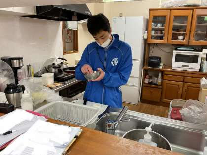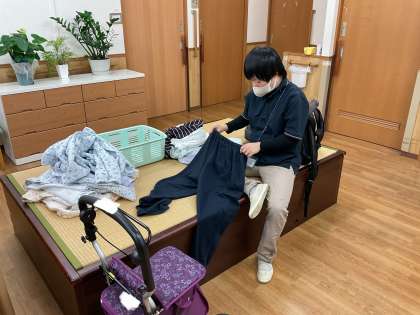 高等部の地域実践活動として「洛和グループホーム山科小山」で活動に取り組みをました。利用者の皆さまの洗濯物を丁寧に畳んだり、昼食の準備をしたりしました。「洗濯物はこうやって畳むんやで」、「孫が来てくれたかと思って嬉しかったわ」など、利用者の方々と作業を通して会話をしながら作業に取り組む姿が見られました。