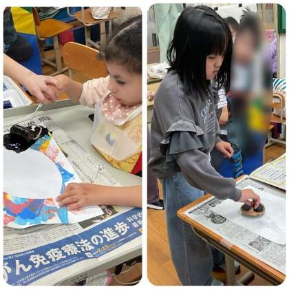 3年生の造形活動の様子です。今日は、紙版画に取り組んでいました。画用紙を貼り合わせて「青おに」や大好きな「風船」を版画にしました。ローラーを使いインクを塗ったり、馬簾でしっかりと色をのせたりしていました。一色で仕上げたり、たくさんの色を重ねたりしていました。手元をよく見て作品を仕上げていました。