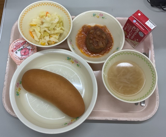 高等部3年生のみなさん、ご卒業おめでとうございます。今日の給食は、卒業をお祝いし、ひとつひとつ心をこめてハンバーグを手作りし、トマトソースで煮込みました。高等部3年間で580回くらい給食を食べました。心も体もとても成長しましたね。これからもずっと食べることを大切にできる人になってください。