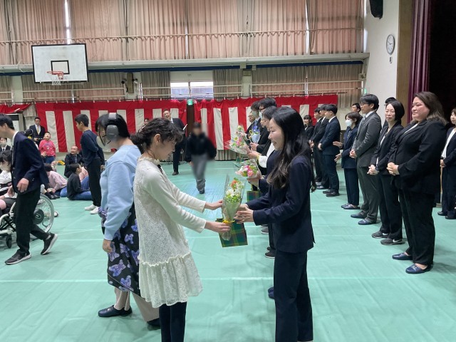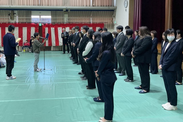 本日、体育館にて離任式を行いました。退職・離任される教職員の方から心のこもったご挨拶をいただいた後、代表の児童生徒がお別れの言葉を伝えました。その後、児童生徒一人ひとりが、これまでの感謝の気持ちを込めて花束を贈呈しました。最後に、全員で校歌を斉唱し、別れを惜しみながら花道をつくって退職・離任される先生方を見送りました。これまで本校のために尽力していただき、本当にありがとうございました。新しい場所でのご活躍を心よりお祈り申し上げます。