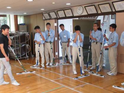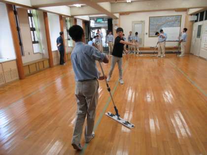メンテナンスでは,ダストクロスモップの扱い方を学んでいました。ジグザグに掃いていくのはなかなか難しいようです。