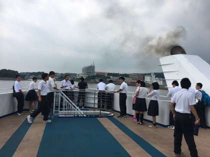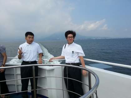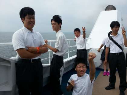 フェリーで熊本に向かっています。風がきついようですが,海風が気持ちよさそうな表情ですね。