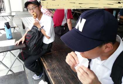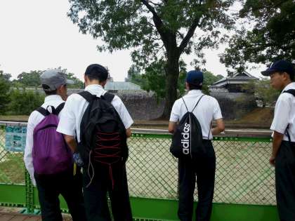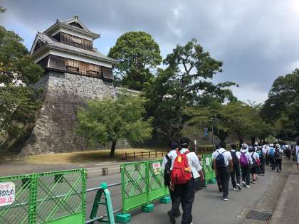 全員で熊本城を見学した後は,桜の馬場でグループ別研修です。グループごとに昼食を食べたり,買い物などを行っています。