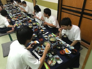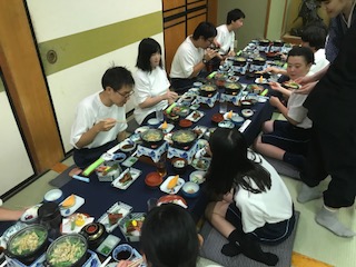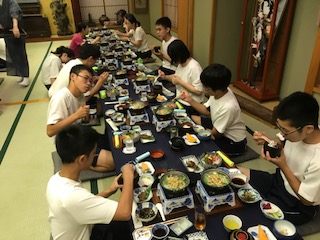 ようやく18時過ぎに今日のお宿「貞千代」さんに到着。今日は暑い中でしたが,みんな元気にしています。疲れもあるので,夕食までの間にシャワーを浴びてスッキリしました。夕食の時間は少し遅らせて19:00から始まりました。今日はみんなよく歩いたので「お腹すいたぁ」と夕食を楽しみにしていました。明日も元気に活動できるようにいっぱい食べています。この後は,入浴して,20:30からミーティングがあります。ミーティングでは,今日の振り返り,お小遣い帳の記入,明日の予定確認をする予定です。