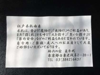 1日目の宿「貞千代」さんより,素敵なお土産がありました。「江戸木札」というものだそうです。昔より木札は,「魔除け」「虫よけ」のご利益があると言われているようです。災いを消す「消し札」とも呼ばれているものだそうです。