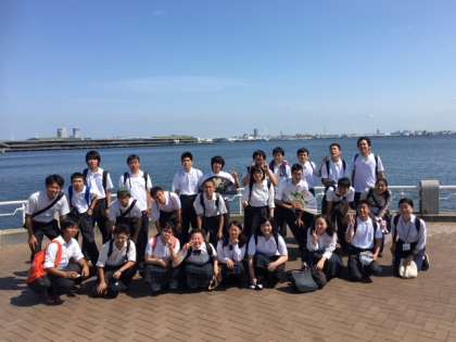 ホテルを出発し,徒歩にて山下公園へ行きました。山下公園をクラスで散策中です。赤い靴を履いてた女の子像の前でパシャり。みんなで記念撮影です。
