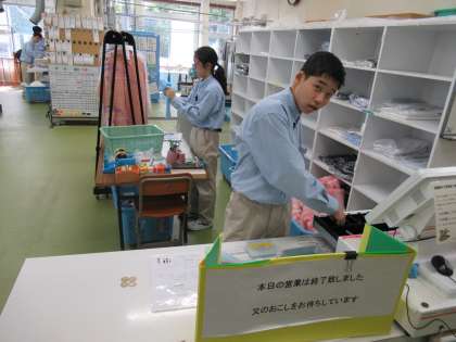 クリーニングでは,受付やアイロン,プレス機など,役割分担して,作業に取り組んでいます。