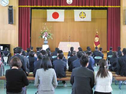 当日は、春らしい暖かさで、桜の花も満開になりました。その中、新入生全員が初々しい様子で入学式に参加しました。