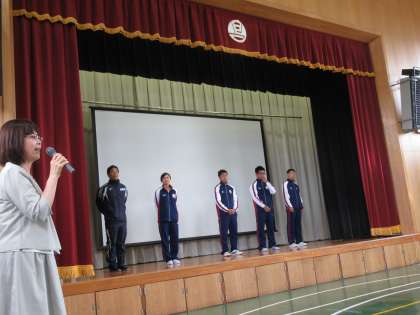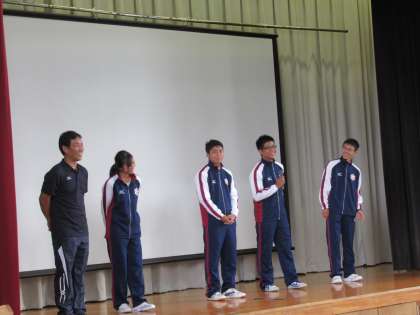 京都大会で好成績をおさめた本校の3名が,12日(土)から茨城県で行われる第19回全国障害者スポーツ大会に京都代表選手として出場します。前期終業式のあと,「壮行会」を行い,児童生徒・教職員からエールを送られました。
