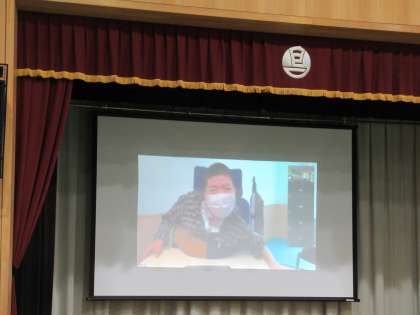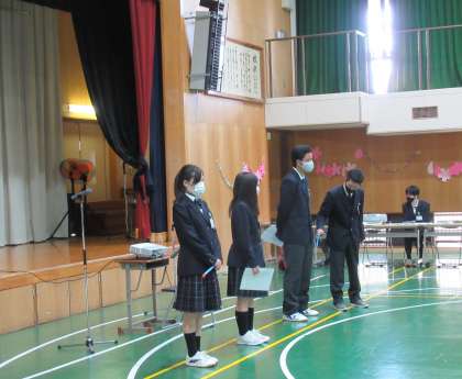 小学部・高等部普通科と高等部生活産業科とテレビ会議システムでつないで体育館で新入生歓迎会を行いました。学校紹介では,2・3年生が,挨拶の仕方,職員室の入り方,制服のきこなし方について,デモンストレーションも取入れながら,丁寧な説明をしていました。
